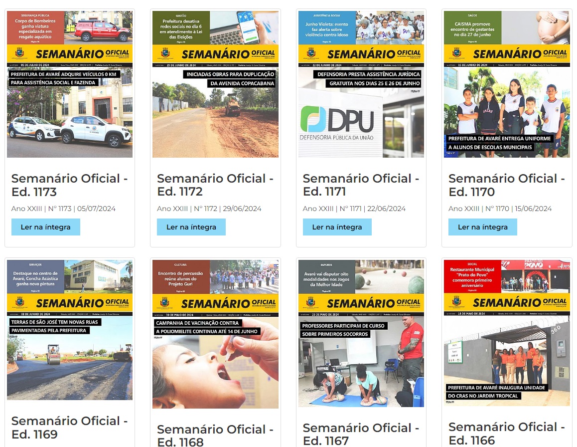 Ambos podem ser encontrados no site oficial do município (avare.sp.gov.br). Basta acessar a página eletrônica e clicar em “Semanário”, à direita, na parte superior da página eletrônica.