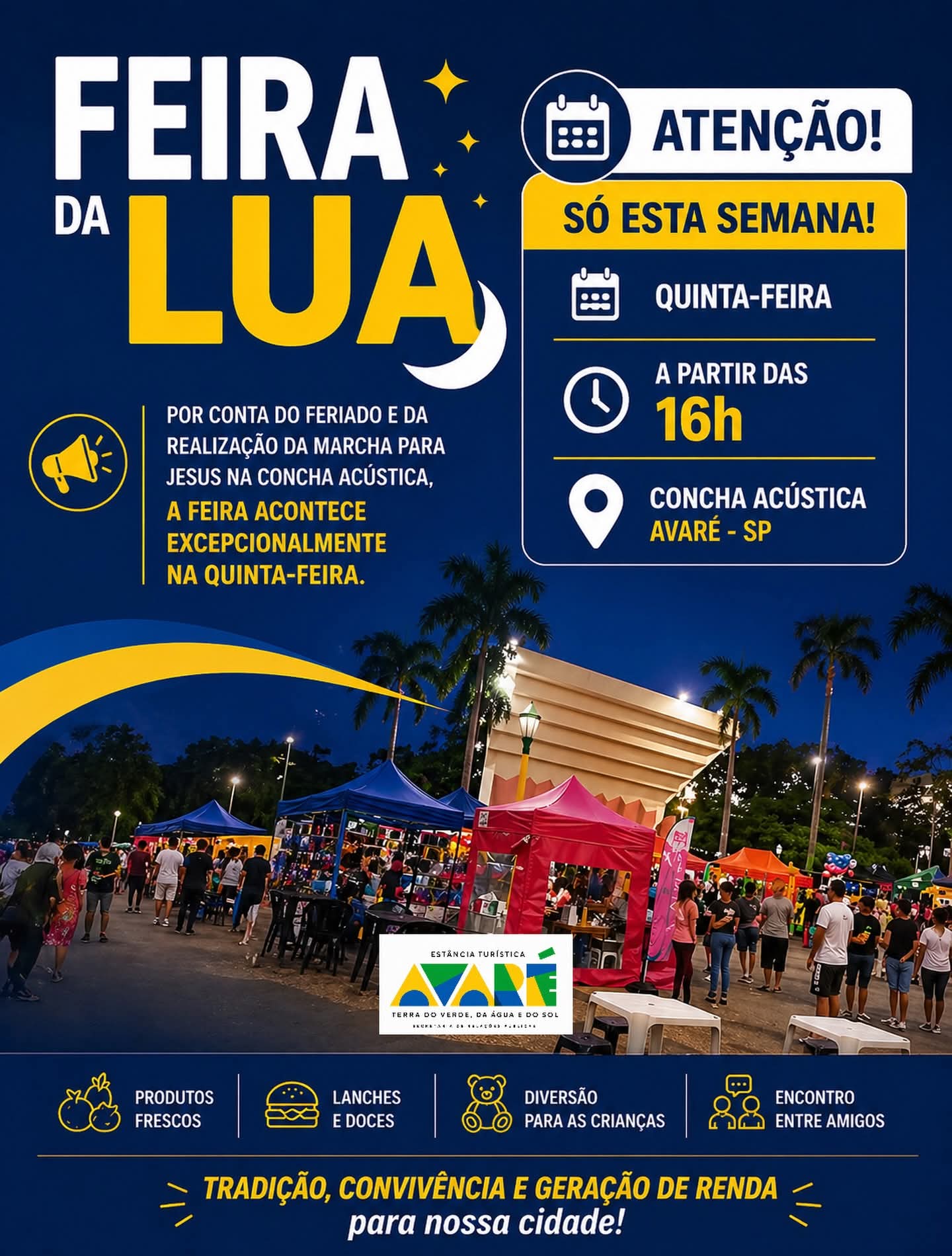 Uma das programações mais aguardadas da semana pelos moradores de Avaré terá mudança excepcional nesta semana. Em razão do feriado de 1º de maio e da realização da Marcha para Jesus na Concha Acústica, a tradicional Feira da Lua acontecerá na quinta-feira, 30 de abril, a partir das 16 horas.