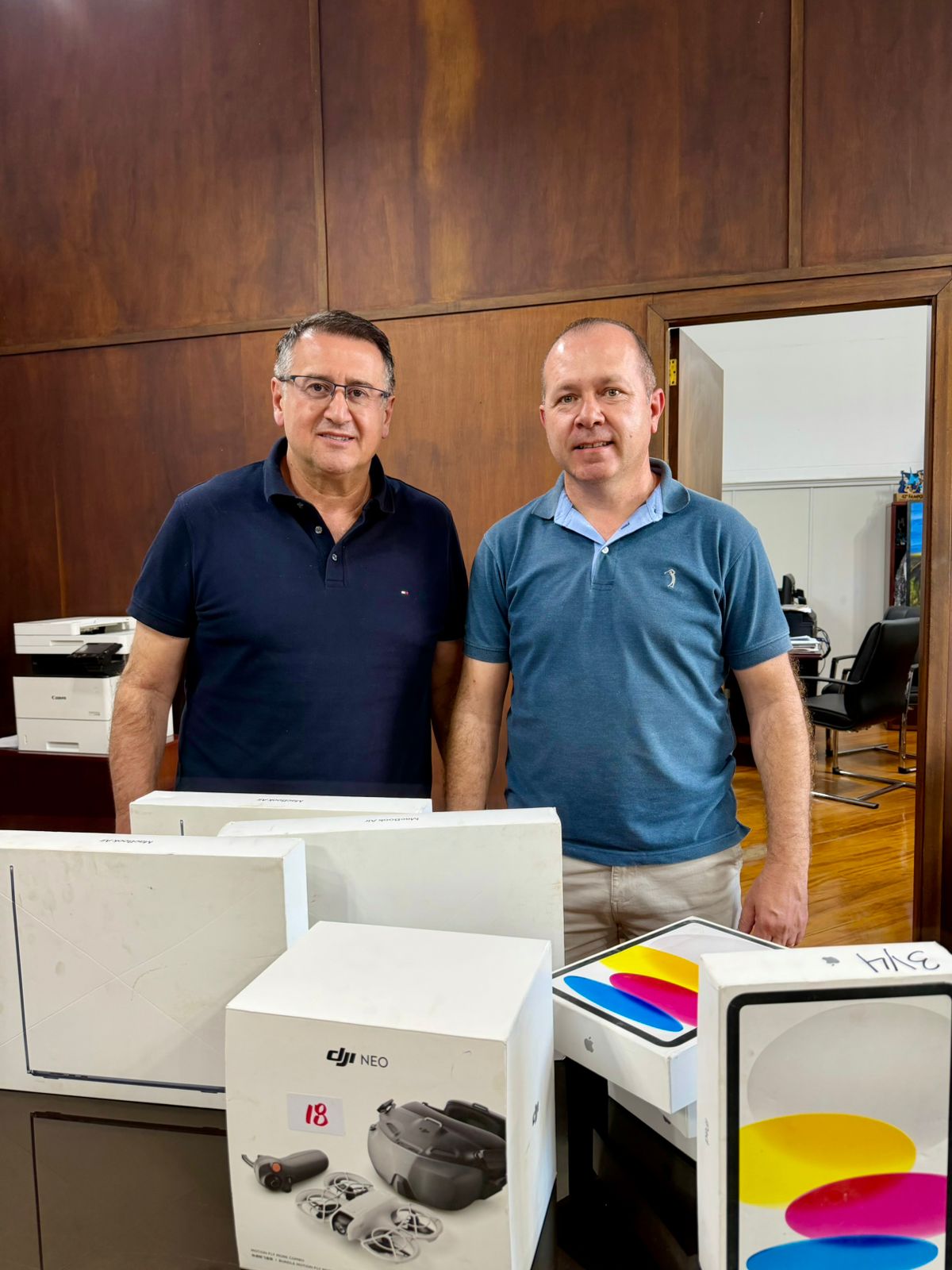 Os equipamentos, três Macbooks, quatro iPads e um drone, foram recebidos pelo secretário da Indústria e Comércio Ricardinho de Oliveira e pelo assessor Nicolas Theo Leprevost Guelmann na sede da Delegacia Federal de Bauru, na sexta-feira, 17 de abril.