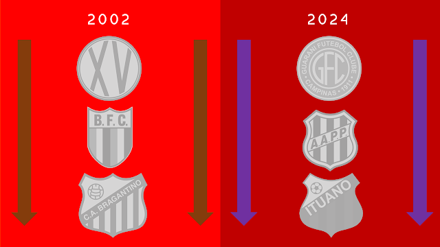 Em 2002, Botafogo de Ribeirão, Bragantino e XV de Piracicaba desceram da Série B para a Série C – porém naquela temporada eram seis os times a serem rebaixados. Agora em 2024, caem da ‘Segundona’ para ‘Terceirona’, Guarani, Ponte Preta e Ituano.