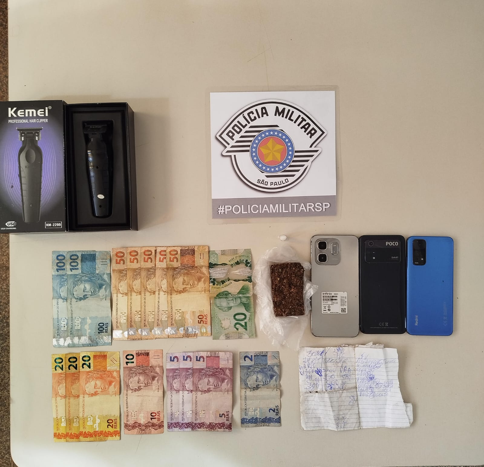 Em patrulhamento pela Rua Maranhão próximo à orla do lago, a equipe policial-militar avistou um indivíduo andando pela via, o qual ao avistar a viatura, dispensou algo e mudou seu trajeto. O homem foi abordado e na busca pessoal foram localizados meio “tijolo” de maconha, 01 (um) microtubo com cocaína, R$ 537,00, 01 (uma) nota de vinte dólares canadense, 01 (uma) folha com anotações diversas, (03) três aparelhos celulares, e 01 (um) aparelho de barbear que não foi apreendido. O homem de 37 anos foi encaminhado para a Delegacia de Polícia da cidade, de onde será encaminhado para a Cadeia Pública de Piraju e aguardará audiência de custódia. Obs: o aparelho de barbear foi entregue a familiar.
